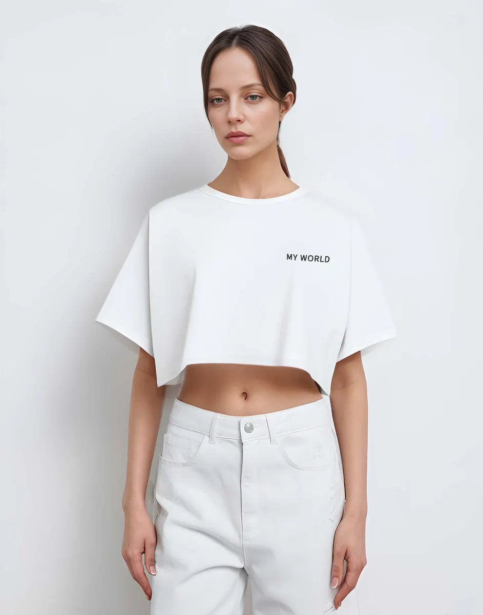 Белая укороченная футболка oversize с принтом GKT023090-2 купить по